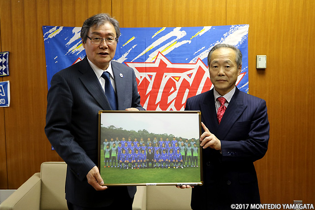 東北シルク様はシルク印刷をはじめ、多様な印刷物の製作を行っています。このたび贈呈いただいた写真は、GWの4月28日~5月7日までの期間は、山形県総合運動公園総合体育館1F 受付カウンター前に展示し、一般の皆様にもご覧いただきます。その後、試合当日NDソフトスタジアム山形の来賓フロアエントランスへ展示いたします。