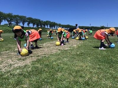 姿勢を低くしてボールをコロコロ…みんな真剣に取り組みました。