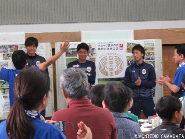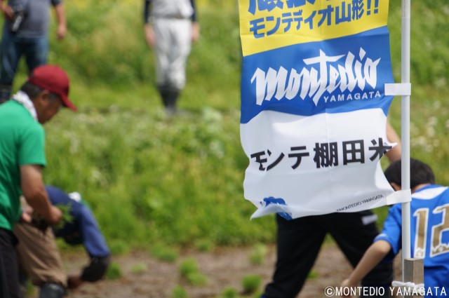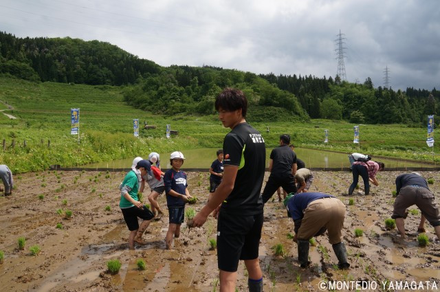 この大蕨棚田は、日本の棚田百選にも選ばれていますが、近年は進んでいく高齢化や耕作の担い手不足により耕作地が減っており、「グループ農夫の会」が立ち上がり、大蕨地区の皆様とともにこの棚田の再生事業を2011年より行っています。そしてモンテディオ山形のこの再生事業に協力し、毎年田植え、収穫に選手・スタッフが参加し、収穫される品種「里のゆき」は「モンテ棚田米」としてホームゲームでも販売されます。