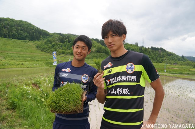 「実は去年まで高校で毎年田植えしているんですよ!」と田植え中でも声をかけてくれた髙橋成樹選手。上山明新館高等学校の食料生産科出身、慣れた手つきでの田植え。