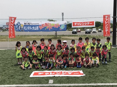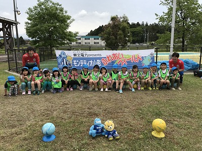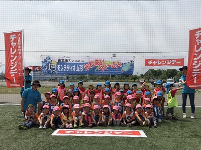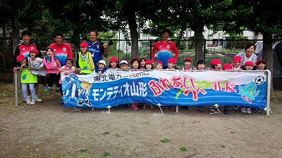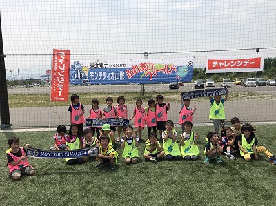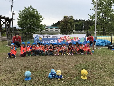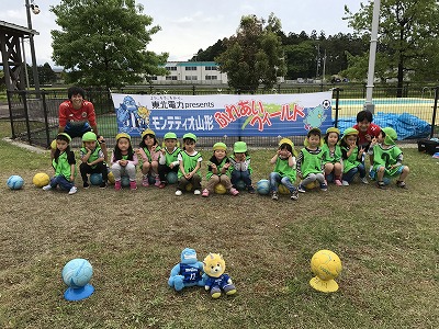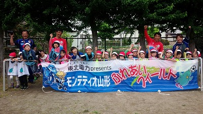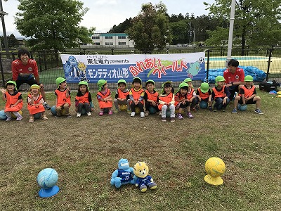 東北電力presentsモンテディオ山形ふれあいフィールドでは地域貢献活動の一環として、幼稚園・保育園・小学校を対象に、アカデミーコーチを派遣し実施しているサッカー教室です。