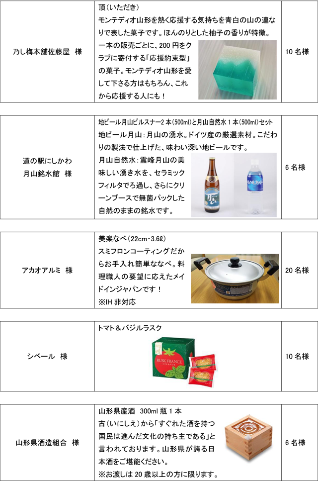 モンテディオ山形の勝利に貢献した選手が表彰されます。また、ご来場いただいたお客様も、「おいしい山形サポーター賞」にご応募いただくと抽選で以下の豪華賞品をお届け!
