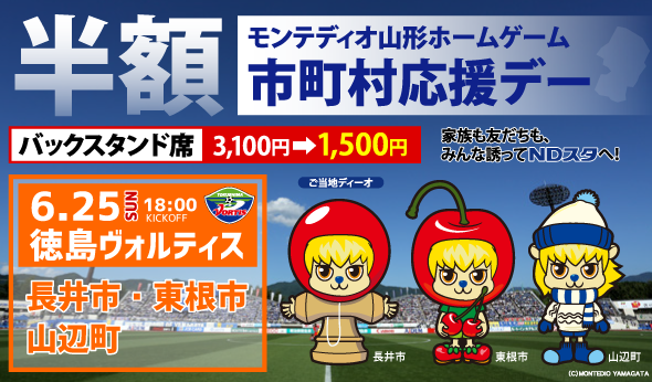 2017年6月25日(日)に開催されるホームゲーム 徳島ヴォルティス戦において、東根市・長井市・山辺町在住・在勤の方を対象に、バックスタンド席一般を当日券価格より半額以下で購入できるお得な「市町村応援デーチケット」を販売しますのでお知らせします。対象の市町村に在住・在勤の方は是非スタジアムにお越し頂きサッカーをお楽しみ下さい。