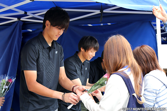 6月最初のホームゲーム・ザスパクサツ群馬を迎えての一戦は、2017モンテディオ山形ファンクラブ会員レディースデーとして開催されました。レディース会員の方を無料招待をしたほか、切りバラのプレゼントなど女性限定のイベントも行いました。