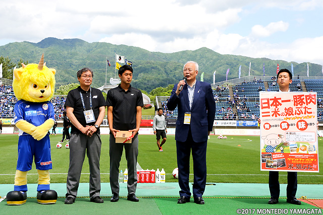 金山町からは「米の娘ぶたロース肉630g40パック」の贈呈も頂戴しました。金山町からは鈴木洋町長にもスタジアムにお越し頂き激励も頂きました。いつも熱いご支援を頂き本当に有難うございます。