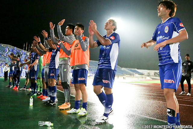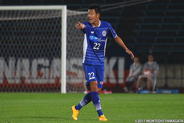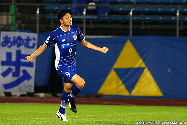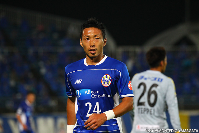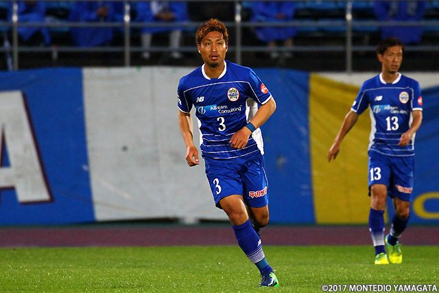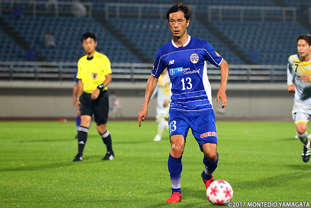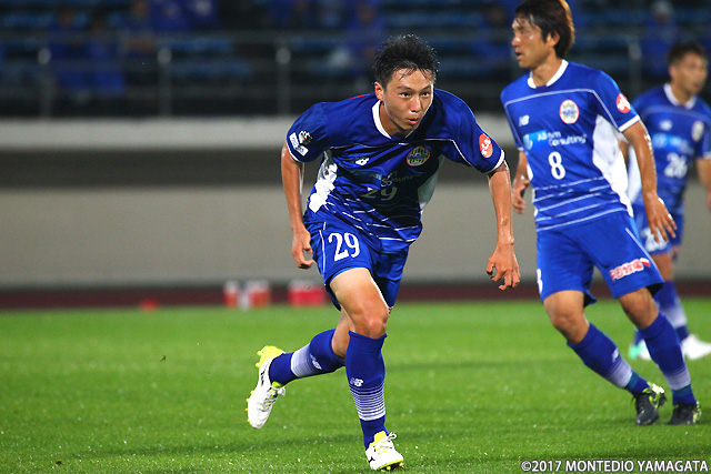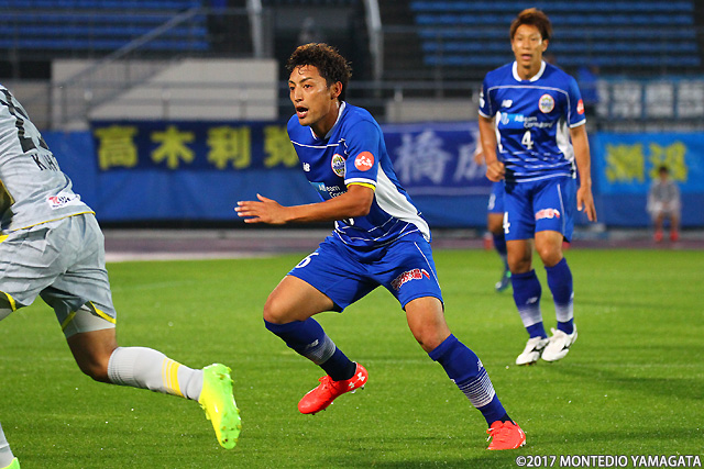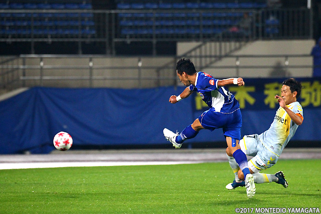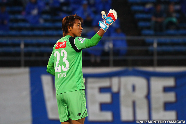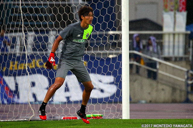 ゴールマウスを守ったのは富居大樹選手。モンテディオ山形加入後の試合出場は少ないものの、実績のある選手だけに、水を多く含んだピッチコンディションでも安定したプレーを見せます。