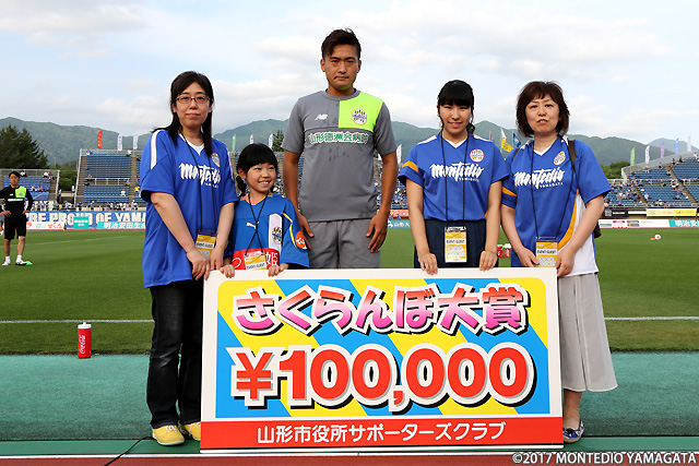ピッチ内ウォーミングアップ前、山形市役所サポーターズクラブによる前期MVP「さくらんぼ大正」の表彰が行われました。選ばれたのは、今季ここまでのJ2リーグ戦にフルタイム出場し、守備陣を牽引するNo.5菅沼駿哉選手でした。