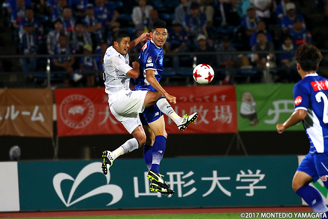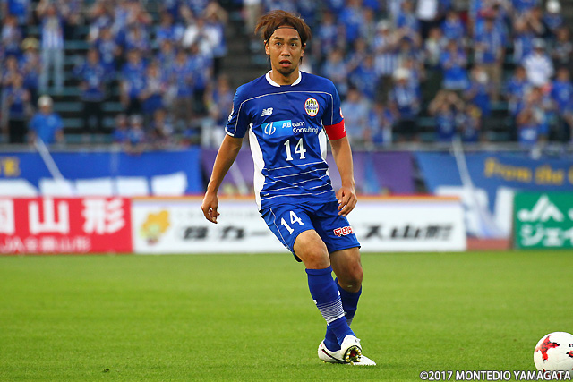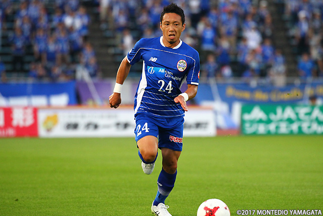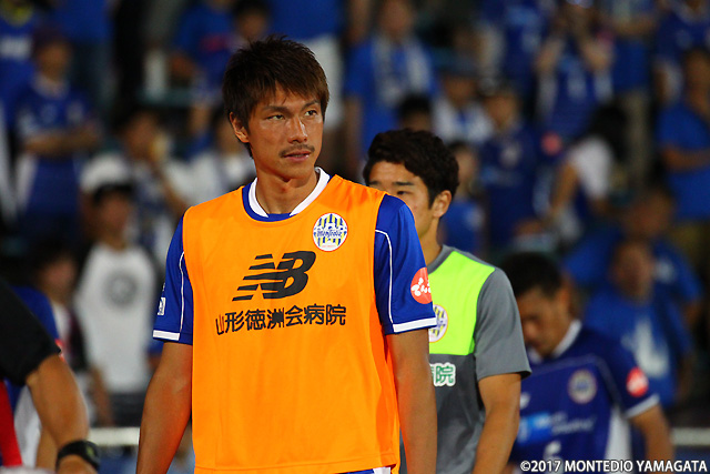 7試合振りの先発出場となった荒堀謙次選手は右サイドに入り、ワイドで攻撃の起点になる役割を果たします。この試合モンテディオ山形唯一の得点となった鈴木雄斗選手のゴールをアシストしたのも荒堀選手でした。
