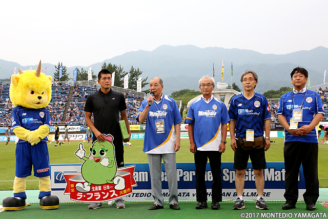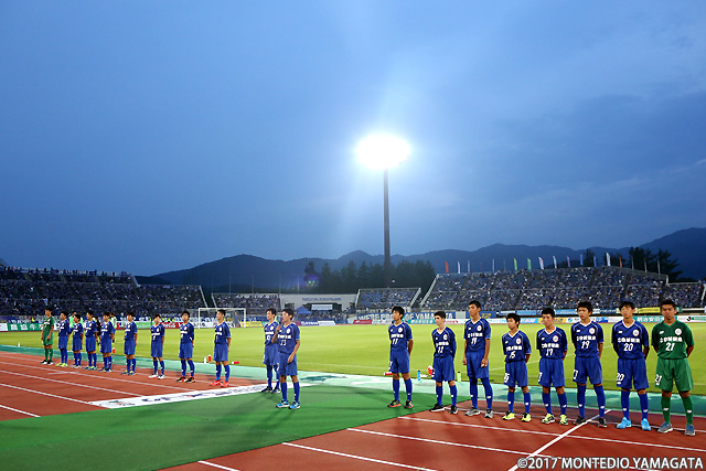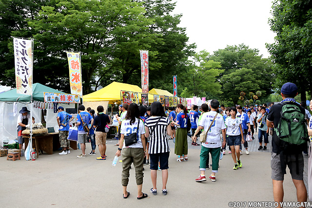 両チーム得点がなく0-0でむかえたハーフタイムには、先日行われた第32回日本クラブユースサッカー選手権(U-15)で全国大会出場を決めた、モンテディオ山形ジュニアユース村山の壮行会が行われます。若きモンテディオ山形の選手たちにスタンドからも頑張ってこいと大きな声援が掛けられます。