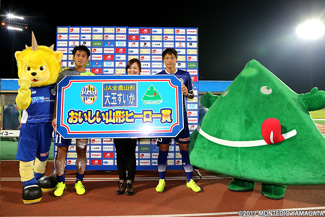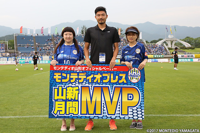 ピッチ内ウォーミングアップ前、6月の山新月間MVP賞の表彰が行われました。選ばれたのは天皇杯も含めて6月に開催された全5試合に出場し、3ゴールを決めた瀬沼優司選手です。