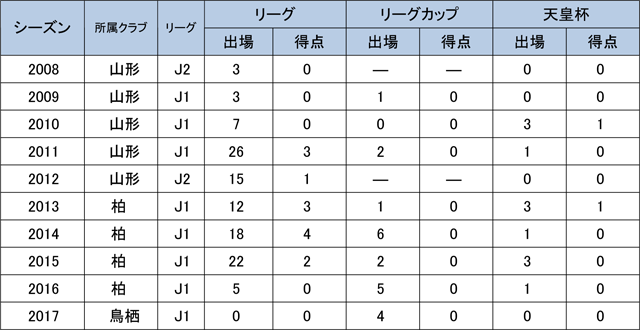 柏レイソルU-12→柏レイソルU-15→柏レイソルU-18→モンテディオ山形→柏レイソル→サガン鳥栖