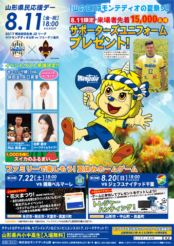 「山形県民応援デー」を含む夏休みホームゲーム告知ポスターをご希望の方にお一人様1枚を上限にお渡しいたします。お渡しするポスターについては、店舗・事務所など人目につく場所等にご掲示いただき、山形県民応援デーPRへの御協力をお願いします。