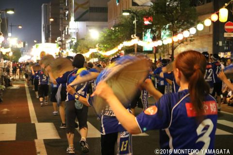 モンテディオ山形ユニフォームスポンサーの「でん六」様の山車を先頭に、モンテディオ山形サポーター有志の皆様と共に、モンテディオブルーの花笠でパレードし、山形の夜を彩ります。