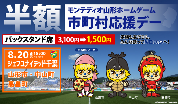 2017年8月20日(日)に開催されるモンテディオの山形ホームゲーム ジェフユナイテッド千葉戦において、山形市・中山町・高畠町在住・在勤の方を対象にバックスタンド席一般を当日券価格より半額以下で購入できる、お得な「市町村応援デーチケット」を販売しますのでお知らせします。対象の市町村に在住・在勤の方は是非スタジアムにお越し頂きサッカーをお楽しみ下さい。