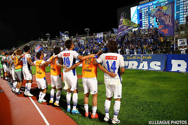 サポーターの皆様との歓喜の瞬間。暑い中の厳しい戦いでしたが、アウェイにも足を運んでくれたたくさんの皆さんの大きな声援の力を受け、勝利をつかむ事が出来ました。