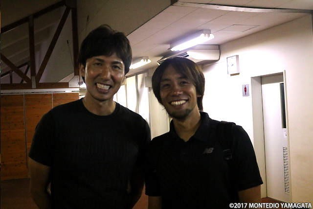 試合後本田選手とカメラに収まるのは、2015シーズンにモンテディオ山形に在籍した中村英之さん。現在はサッカーを始めとする国際的なスポーツの放送権を取り扱うMP&SILVAに在籍し、英語力を生かしグローバルなスポーツビジネスで活躍中です。スタジアムに応援に駆けつけてくれ、「山形のJ1昇格応援しています!」とメッセージも頂きました!