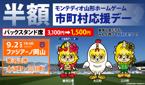 2017年9月2日(土)に開催されるモンテディオの山形ホームゲーム ファジアーノ岡山戦において、寒河江市・大江町・三川町在住・在勤の方を対象にバックスタンド席一般を当日券価格より半額以下で購入できる、お得な「市町村応援デーチケット」を販売しますのでお知らせします。対象の市町村に在住・在勤の方は是非スタジアムにお越し頂きサッカーをお楽しみ下さい。