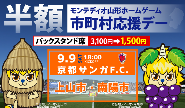 2017明治安田生命J2リーグ第32節京都サンガF.C.戦は、「上山市・南陽市」の市町村応援デーです。対象市町村様より、次の通りチームへの贈呈や来場者へのマッチデープレゼントがありますのでお知らせいたします。