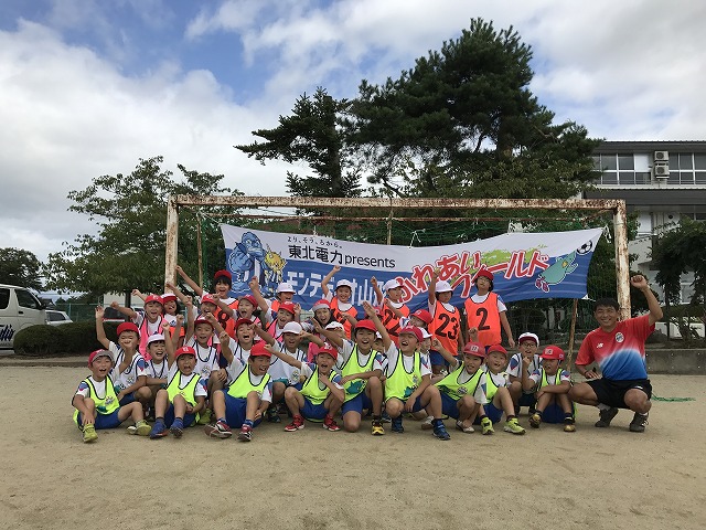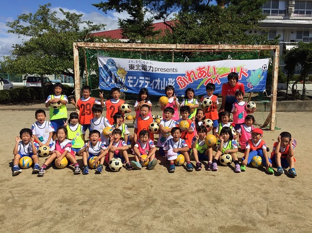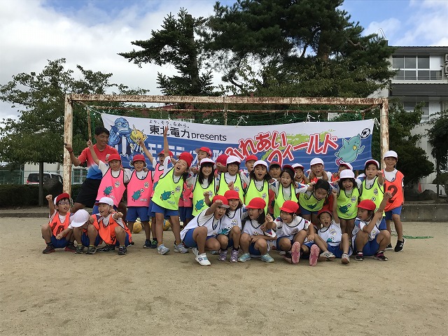 東北電力presentsふれあいフィールドでは地域貢献活動の一環として、幼稚園、保育園、小学校を対象にアカデミーコーチを派遣し、実施しているサッカー教室です。
