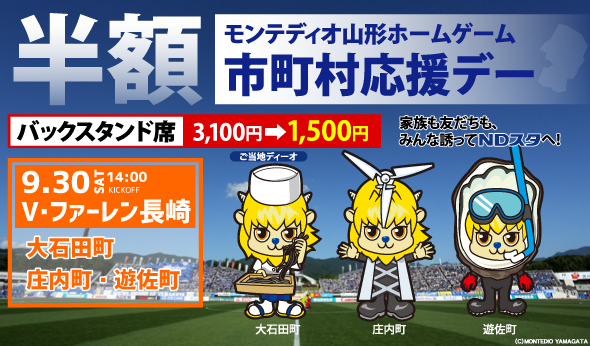 2017年9月30日(土)に開催されるモンテディオの山形ホームゲーム V・ファーレン長崎戦において、大石田町・庄内町・遊佐町在住・在勤の方を対象にバックスタンド席一般を当日券価格より半額以下で購入できる、お得な「市町村応援デーチケット」を販売しますのでお知らせします。対象の市町村に在住・在勤の方は是非スタジアムにお越し頂きサッカーをお楽しみ下さい。
