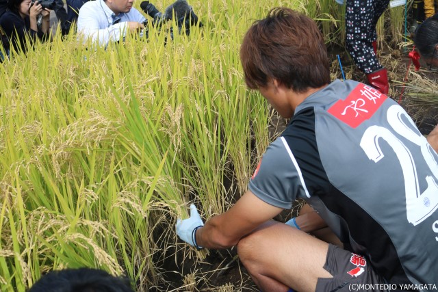 モンテディオ山形の選手は「雪若丸」の収穫を担当。