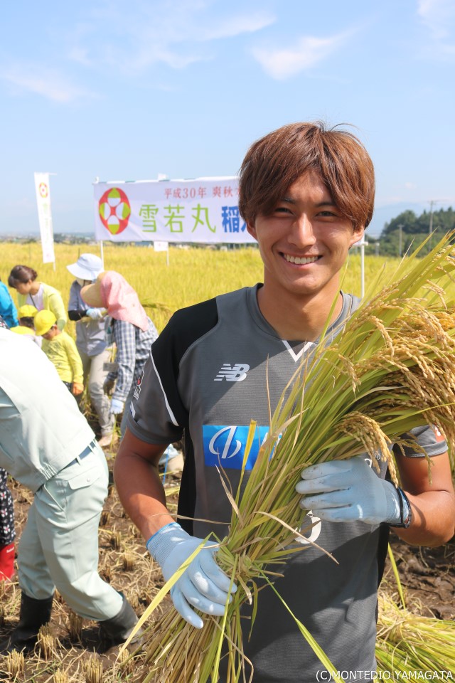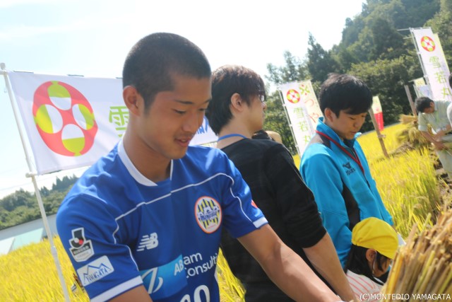 本日2017年9月22日、山形市南西部にある山形県農業総合研究センターで 「つや姫」「雪若丸」稲刈りイベントが行われ、モンテディオ山形からGK摂津颯登選手、DF髙橋成樹選手が参加しました。