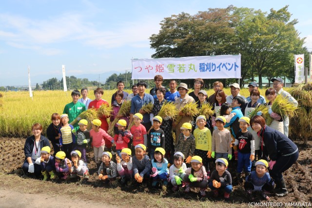 既に山形県内では一部生産が始まっており、9月23日の先行販売開始を明日に控え「つや姫」と共に「雪若丸」の収穫イベントが吉村美栄子山形県知事、つや姫レディー、地元の子供たち、若手新規就農者の皆さんが集まり行われました。