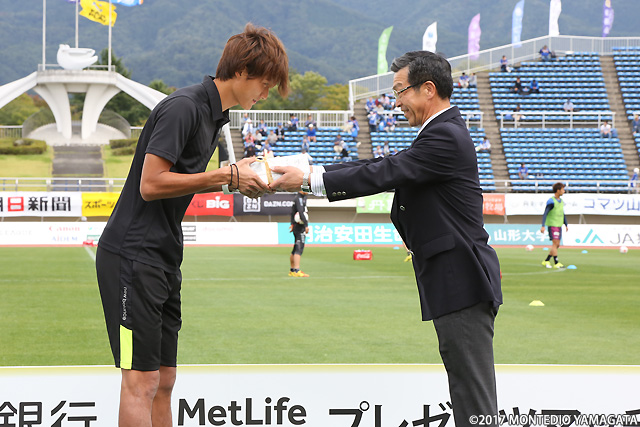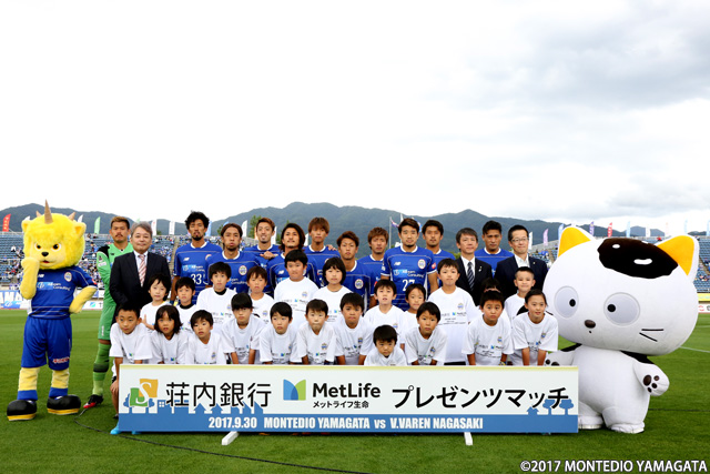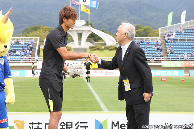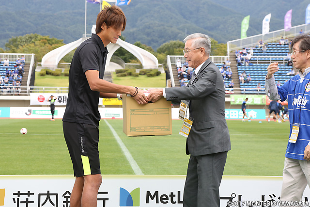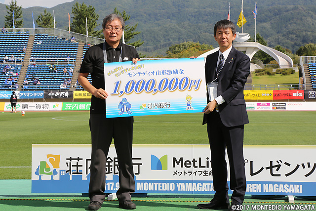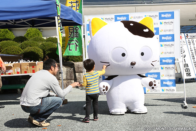 この試合は荘内銀行様による「荘内銀行・メットライフ生命プレゼンツマッチ」として開催。スポーツ応援定期預金「モンテディオ山形熱血応援団2017」からの寄付金の贈呈を頂いた他、荘内銀行イメージキャラクター、タマ&フレンズ~うちのタマ知りませんか~の「タマ」が来場など楽しいイベントを実施して頂きました。