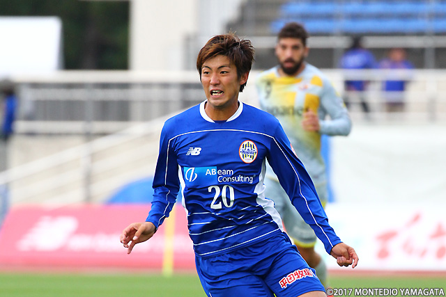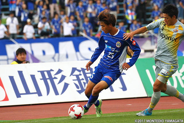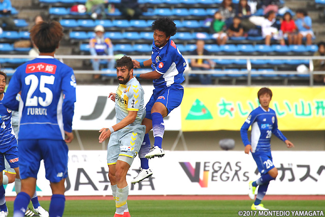 モンテディオ山形の選手として初めてピッチに立った西村竜馬選手。持ち味の高さを生かしてV・ファーレン長崎のフォワード陣と対峙します。
