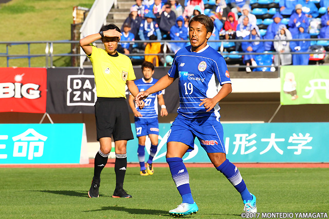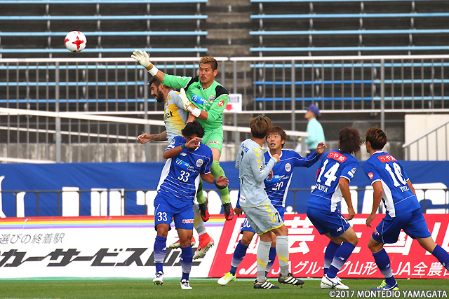 セットプレーでの高い得点力を誇るV・ファーレン長崎に対し、モンテディオ山形の選手たちは児玉剛選手を中心に集中して守ります。