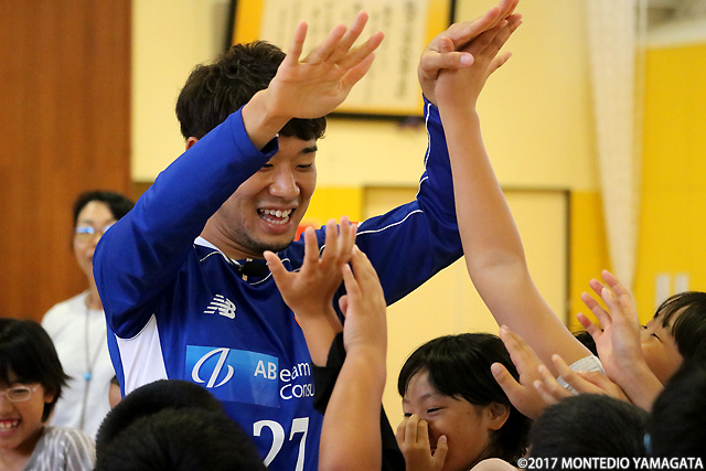 茂木選手は男子チームと対戦。全力で向かってくる子供達に全力で応える茂木選手。子供達との触れ合いで、先程までの緊張が解けたのか笑顔で楽しんでいました。