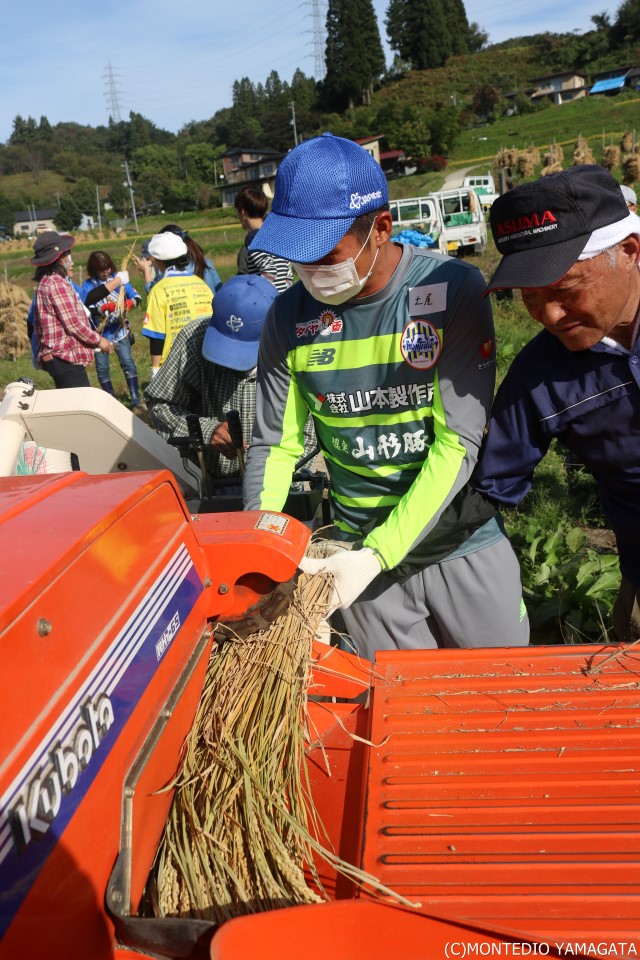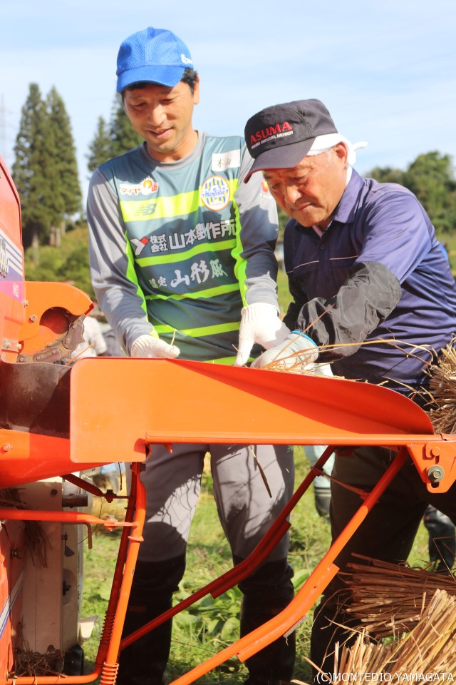 今年も収穫の秋を迎え、先月9月に稲刈り作業を終え、稲杭に乾された稲の脱穀作業が昨日、木山隆之監督をはじめ、モンテディオ山形のコーチングスタッフが参加し、風も穏やかな秋晴れの中、行われました。