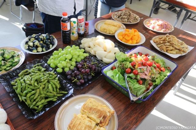 一通り作業を終え、棚田のすぐそばにある、中地区集会所にて交流会が行われ、グループ農夫の会のみなさまに作っていただいた芋煮をはじめとする山形の幸を楽しみながら、グループ農夫の会の皆様、そして遠藤直幸山辺町長を始めとする地域の皆様からモンテディオ山形に多くの激励を頂きました。