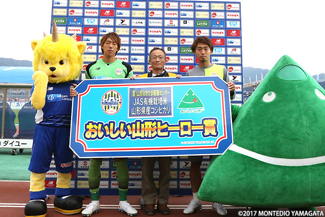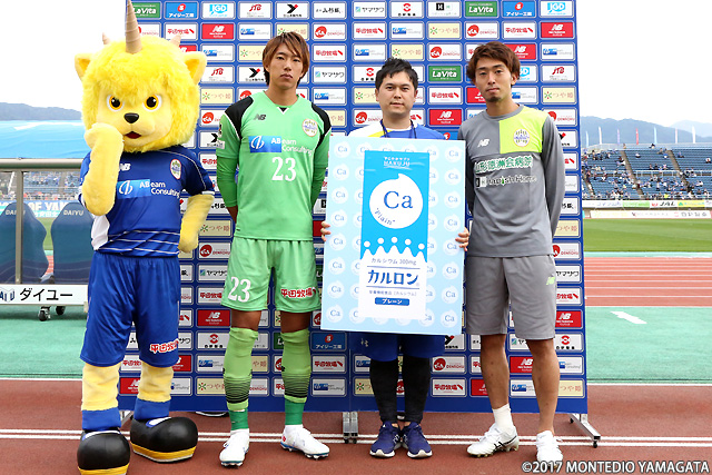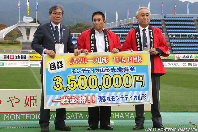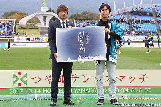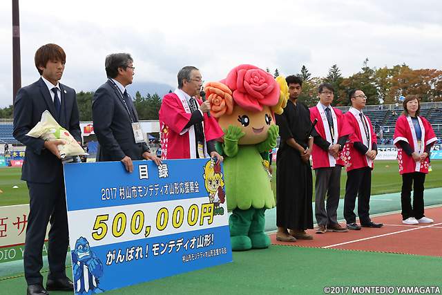 この試合は酒田市・村山市・川西町・小国町応援デーとして行われ各市町からたくさんの方にNDスタにお越し頂いた他、酒田市からは酒田の水を、村山市からは村山市産雪室米10キロとリボンマグネット募金500,000円を贈呈頂きました。また来場者へのマッチデープレゼントには両市だけでなく川西町、小国町よりもご提供を頂きました。改めて御礼申し上げます。