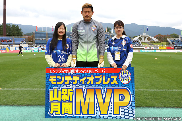 ピッチ内ウォーミングアップ前、9月の月間山新MVP賞の表彰が行われました。選ばれたのは9月に行われた全5試合にフルタイム出場した児玉剛選手でした。