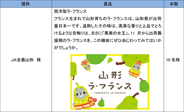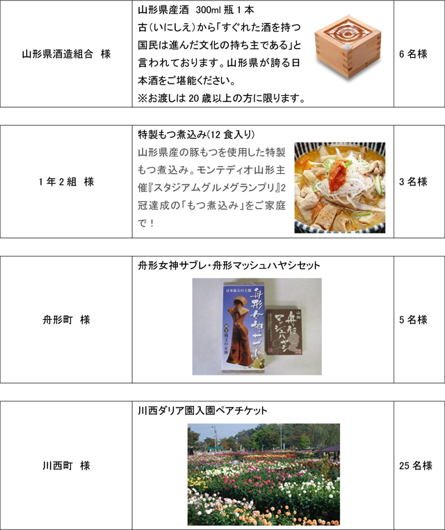 モンテディオ山形の勝利に貢献した選手が表彰されます。また、ご来場いただいたお客様も、「おいしい山形サポーター賞」にご応募いただくと抽選で以下の豪華賞品をお届け!