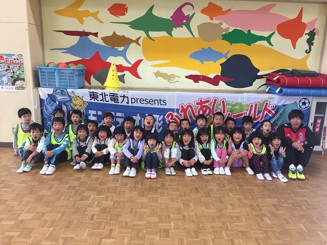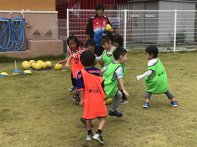 東北電力presentsふれあいフィールドでは地域貢献活動の一環として、幼稚園、保育園、小学校を対象に、アカデミーコーチを派遣し、実施しているサッカー教室です。