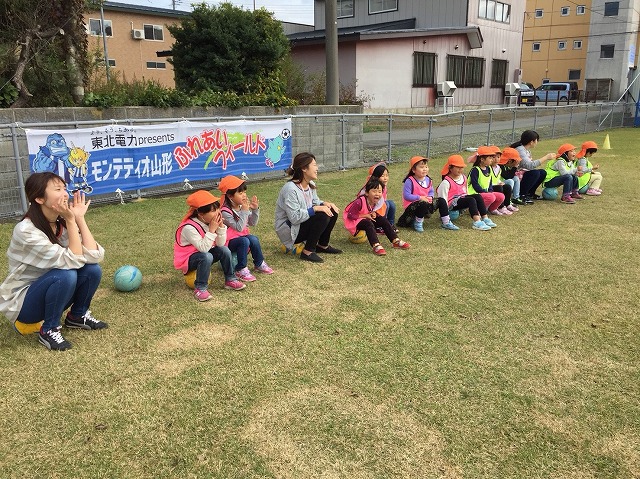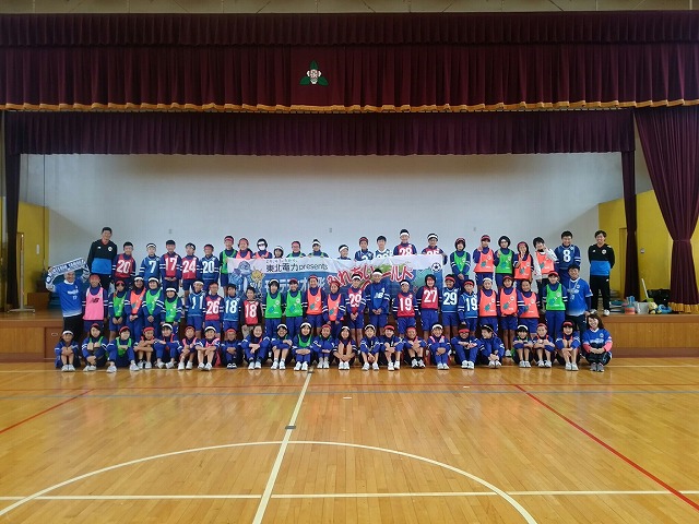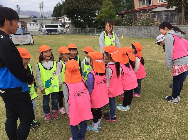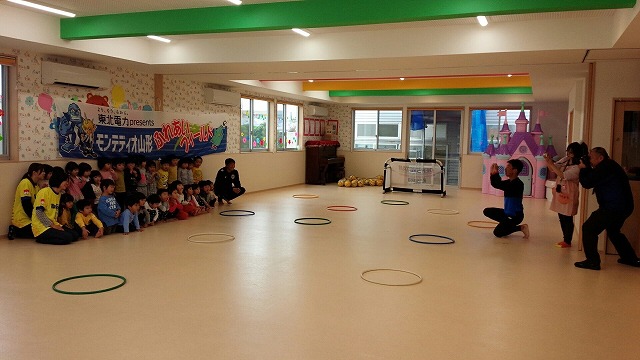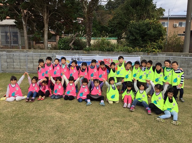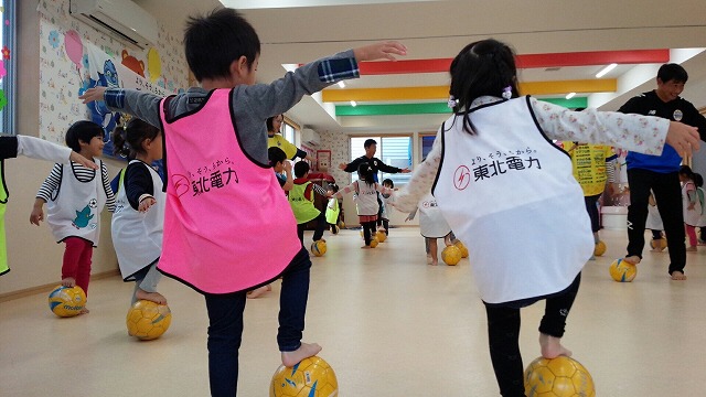 東北電力presentsふれあいフィールドでは地域貢献活動の一環として、幼稚園、保育園、小学校を対象に、アカデミーコーチを派遣し、実施しているサッカー教室です。