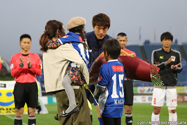 試合前には、Jリーグ通算250試合出場を果たした加賀健一選手への花束の贈呈が行われました。プレゼンターは加賀選手の奥さんと2人のこども達です。
