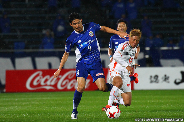 今季チームで唯一全試合にJ2リーグ戦出場している阪野豊史選手。この試合でもエースの存在感を見せます。