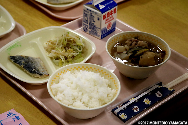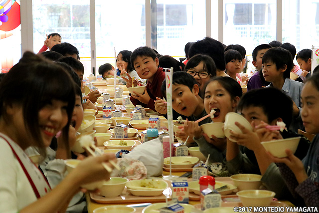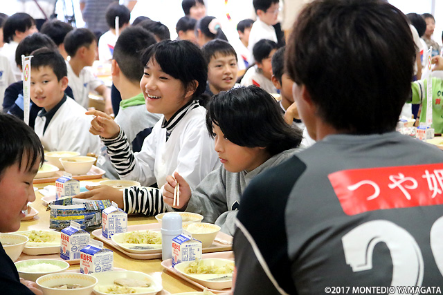 今回の学校給食は山形のお米の新品種「雪若丸」の認知度向上と山形県民の関心を高めるため、学校給食を実施している山形県内の小・中学校等において、「雪若丸」給食を食べるというもの。摂津選手も6年生 のみなさんと「雪若丸」を一緒にいただきました。