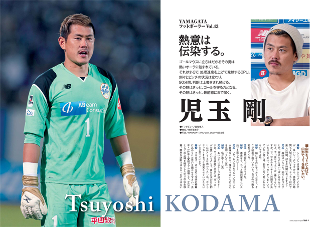 高いビルドアップ力でチームに貢献するGK児玉剛選手のロングインタビュー「YAMAGATAフットボーラー」では、J1で戦いたいという熱意、チームに必要な熱意を熱く語ってもらいました。瀬沼優司選手の私服インタビューでは、最近仲が良いと噂の佐藤優平選手と一日中一緒に過ごすというオフに注目です。