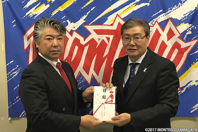 弊社賛助会員の山寺観光タクシー様より、「モンテディオ山形サポートタクシー」の寄付金を、山寺観光タクシー株式会社代表取締役 土屋 秀昭様より贈呈頂きました。