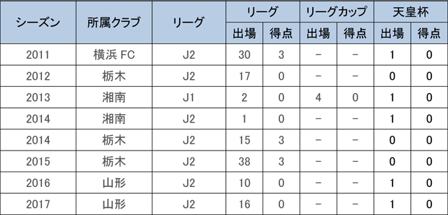 三上JSC→野洲中→野洲高→同志社大→横浜FC→栃木SC→湘南ベルマーレ→栃木SC→湘南ベルマーレ→栃木SC→モンテディオ山形