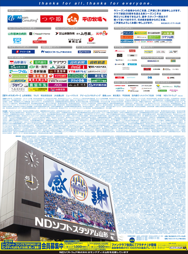 公開日 2017.11.26 2017.11.26山形新聞 支援企業感謝広告「thanks for all, thanks for everyone」 2017年11月26日に山形新聞に掲載させていただいた、モンテディオ山形スポンサー様、正会員様、賛助会員様への感謝広告を紹介致します。支援企業の皆様の2017シーズンのモンテディオ山形への熱いサポートに心より感謝申し上げます。 ※画像をクリック頂くと大きなサイズでご覧になれます。 #その他 ニュース一覧