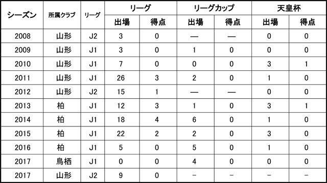 柏レイソルU-12→柏レイソルU-15→柏レイソルU-18→モンテディオ山形→柏レイソル→サガン鳥栖→モンテディオ山形