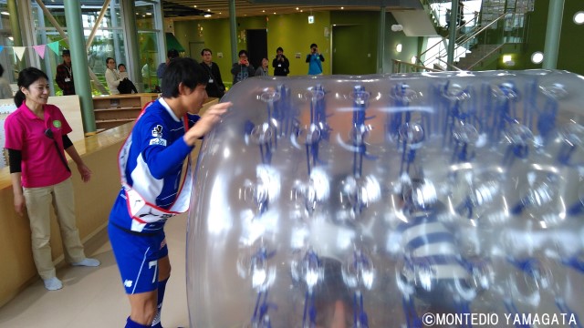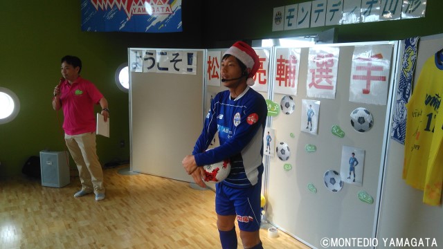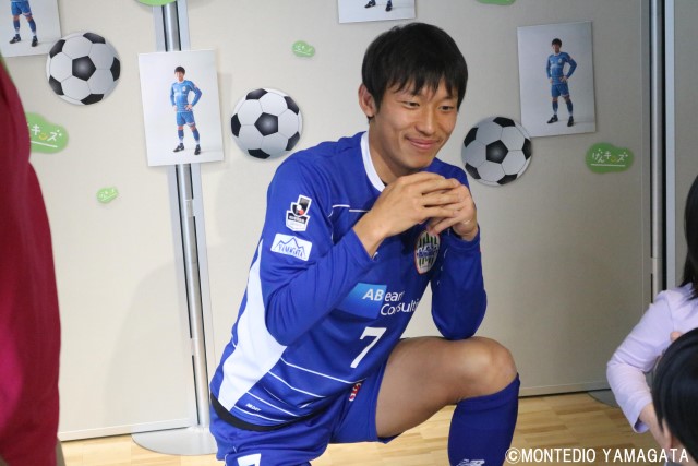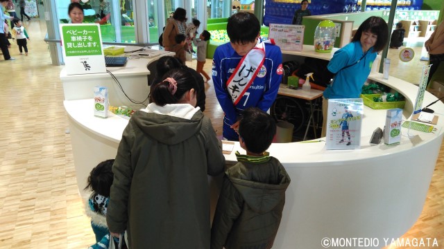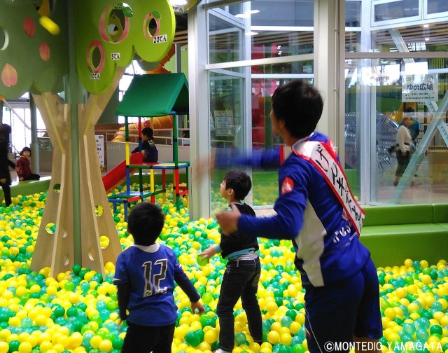 そんな中、本日2017年12月2日、松岡亮輔選手がホームタウンでの活動として、スタジアムから車で数分ほどの距離にある、山形県天童市の「子育て未来館げんキッズ」の一日支配人として子供たちとの交流を行いました。