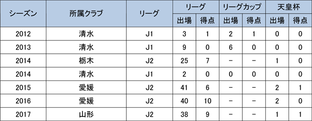 上南SC→上溝南中→桐光学園高→筑波大→清水エスパルス→栃木SC→清水エスパルス→愛媛FC→清水エスパルス→愛媛FC→清水エスパルス→モンテディオ山形