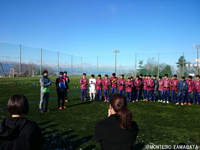 モンテディオ山形のトップチーム選手、そしてアカデミー、トップチームを支える栄養士が協力し、登録チームの枠を越えて、山形県内の高校サッカーのレベル向上を目的に行われたこのクリニック、山形明正高等学校サッカー部のみなさんに 「楽しくサッカーを!」と高橋成樹選手が呼びかけました。