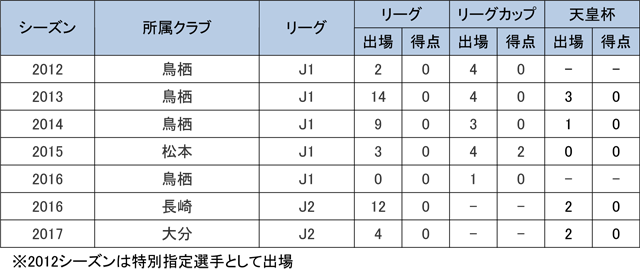 アビスパ福岡U-12→アビスパ福岡U-15→東福岡高→鹿屋体育大→サガン鳥栖→松本山雅FC→サガン鳥栖→V・ファーレン長崎→サガン鳥栖→大分トリニータ